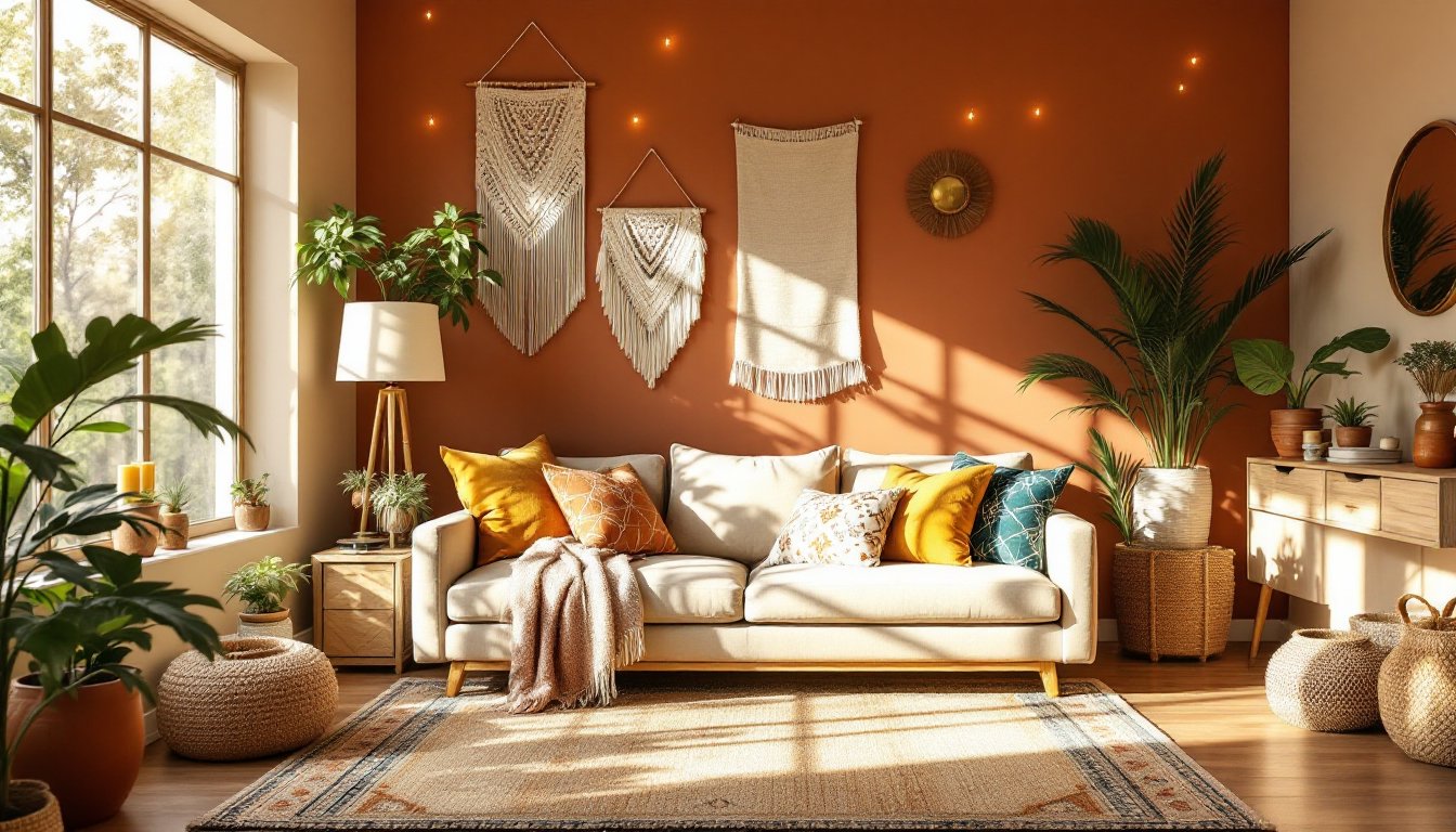 Paint is the quickest, most reversible way to establish color in a boho space. An accent wall in warm terracotta, dusty sage, or even a soft, muted coral creates focus without painting the entire room. If the living room receives natural light, a slightly desaturated version of your chosen color prevents it from feeling too intense.